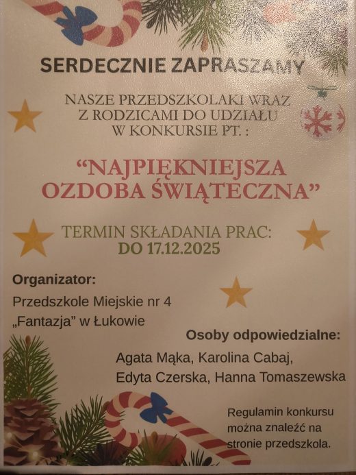 ZAPRASZAMY NA UDZIAŁU W KONKURSIE PLASTYCZNYM PT. „NAJPIĘKNIEJSZA OZDOBA ŚWIĄTECZNA. INFORMACJE DOTYCZĄCE KONKURSU W REGULAMINIE KONKURSY. Regulamin konkursu Najpiękniejsza ozdoba świąteczna
