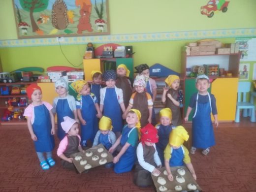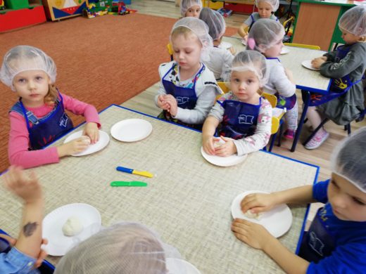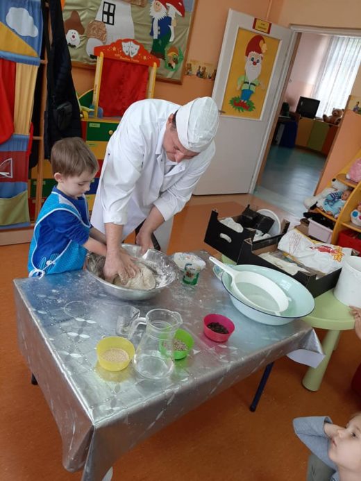 W ramach realizacji projektu „Dobry polski chleb” odbyły się warsztaty z piekarzem z piekarni PSS Społem. Z przygotowanego wspólnie ciasta dzieci robiły bułeczki. Upieczone w przedszkolu bułeczki dzieci zabraly do domu.