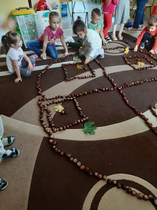 Jesienią Misie podczas spacerów zbierały różne dary, z których stworzyły mandale. Było to zadanie twórcze i kreatywne.