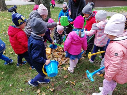Dzieci z grupy Krasnoludki, tradycyjnie jak co roku, sprzataja ogród przedszkolny. Posługiwanie się narzędziami ogrodowymi sprawia im dużo radości, a szeleszczące liście dostarczają wiele przyjemnych wrażeń.