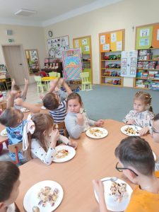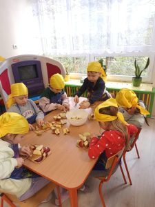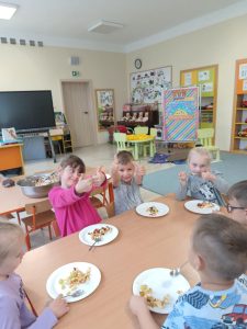 W ramach zaj臋膰 nasze Motylki zamieni艂y si臋 w ma艂ych kucharzy i przygotowa艂y sa艂atk臋 owocow膮 pe艂n膮 kolor贸w i witamin. Dzieci z zaanga偶owaniem my艂y, kroi艂y i miesza艂y owoce, ucz膮c si臋 samodzielno艣ci, wsp贸艂pracy i dbania o zdrowe od偶ywianie.聽
