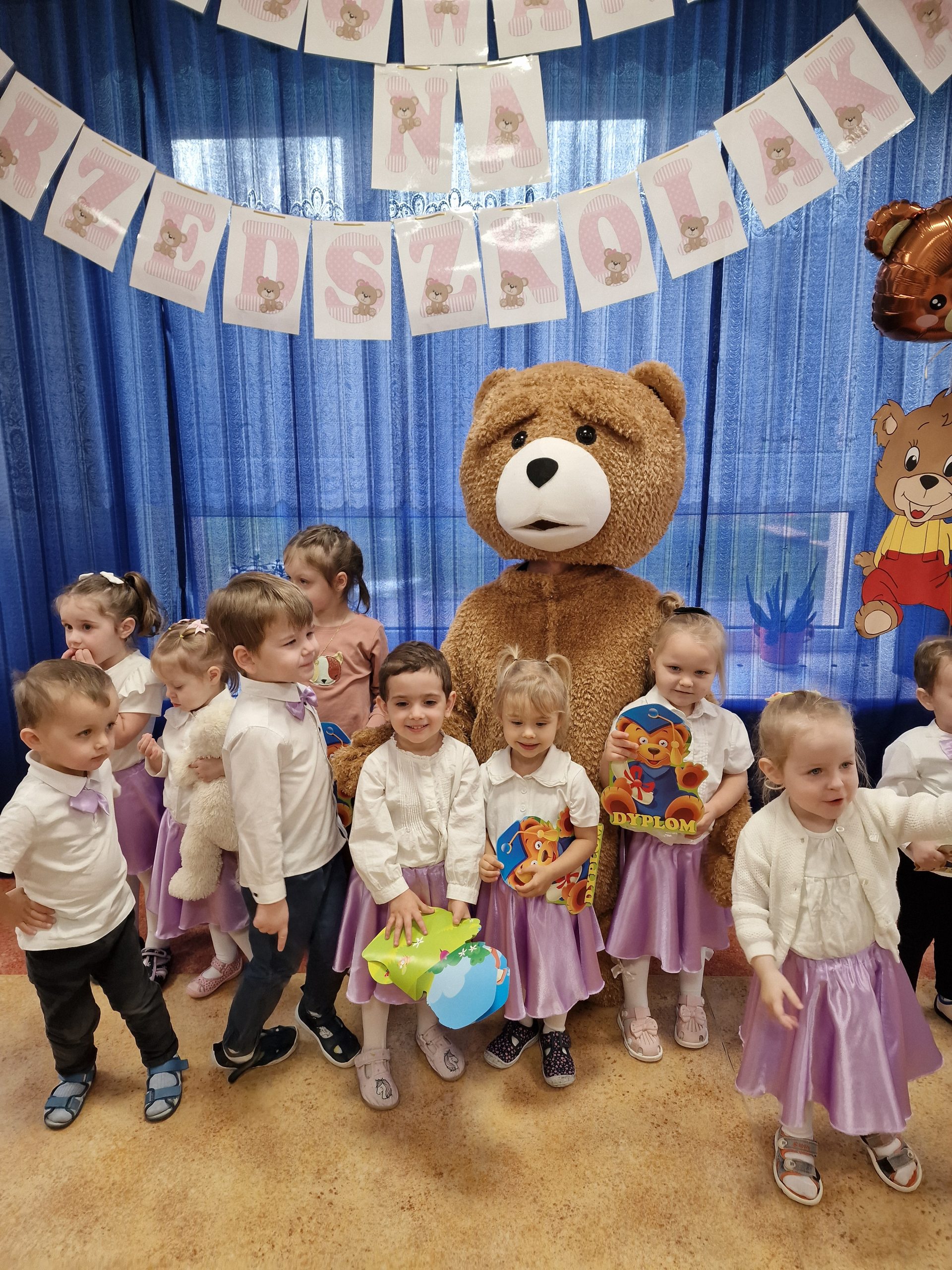 Po części artystycznej nastąpił akt pasowania. Pani Dyrektor, przyjęła dzieci do grona społeczności przedszkolnej. Wszystkie dzieci otrzymały pamiątkowe dyplomy oraz drobne upominki.