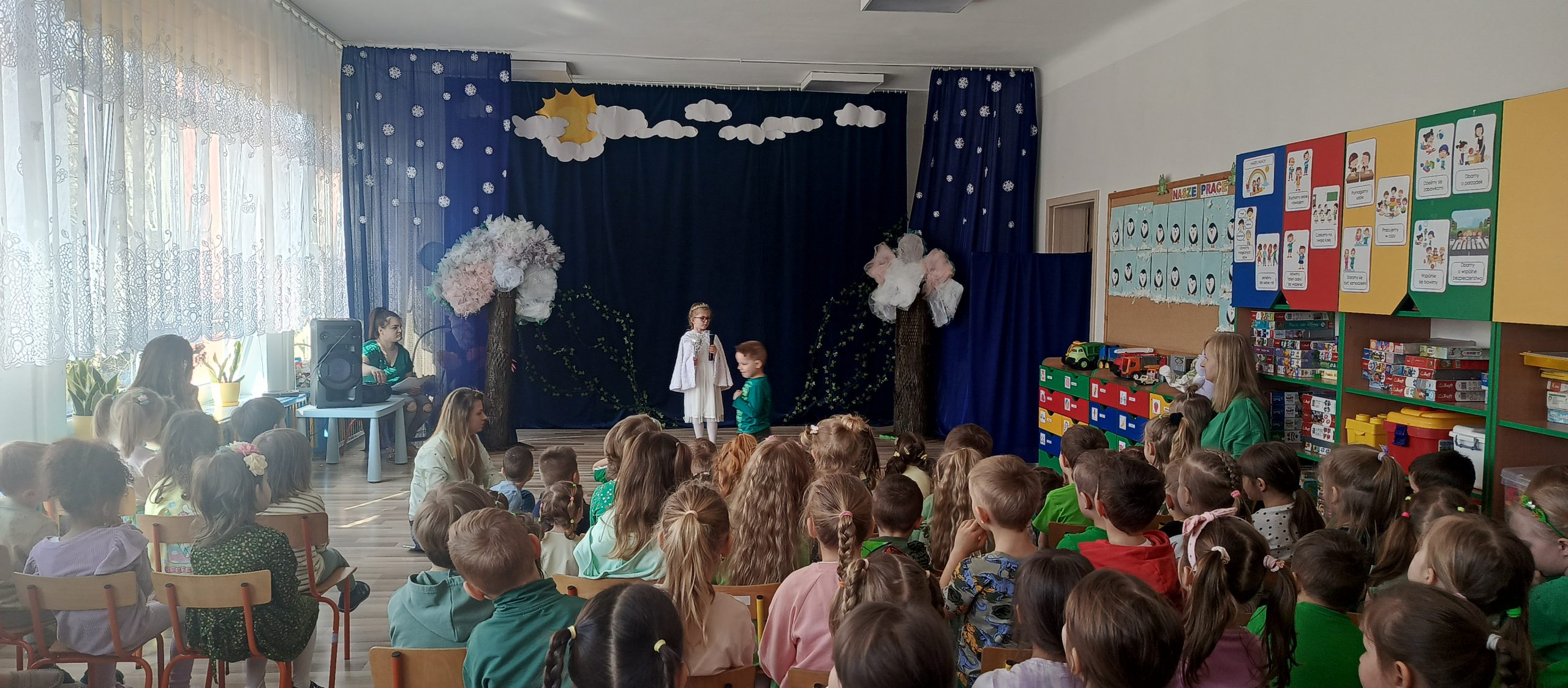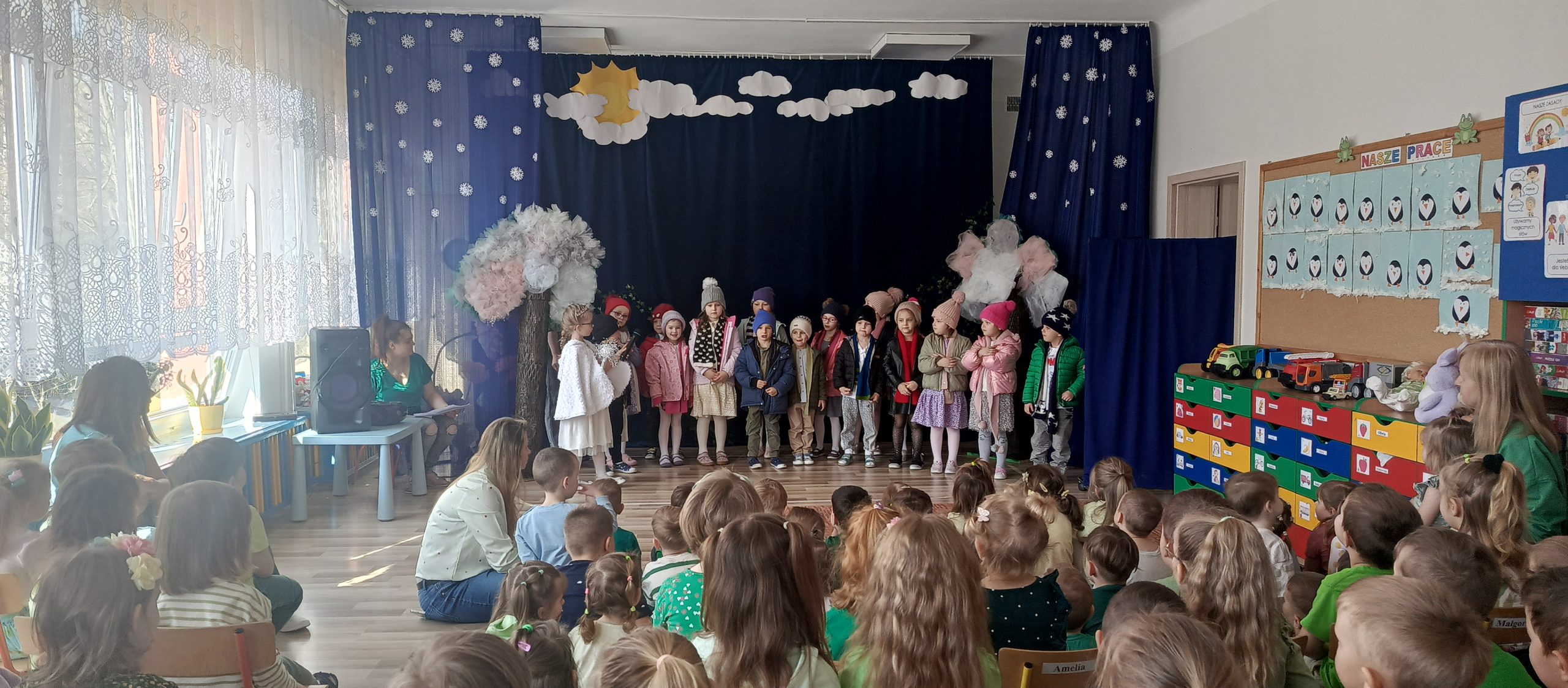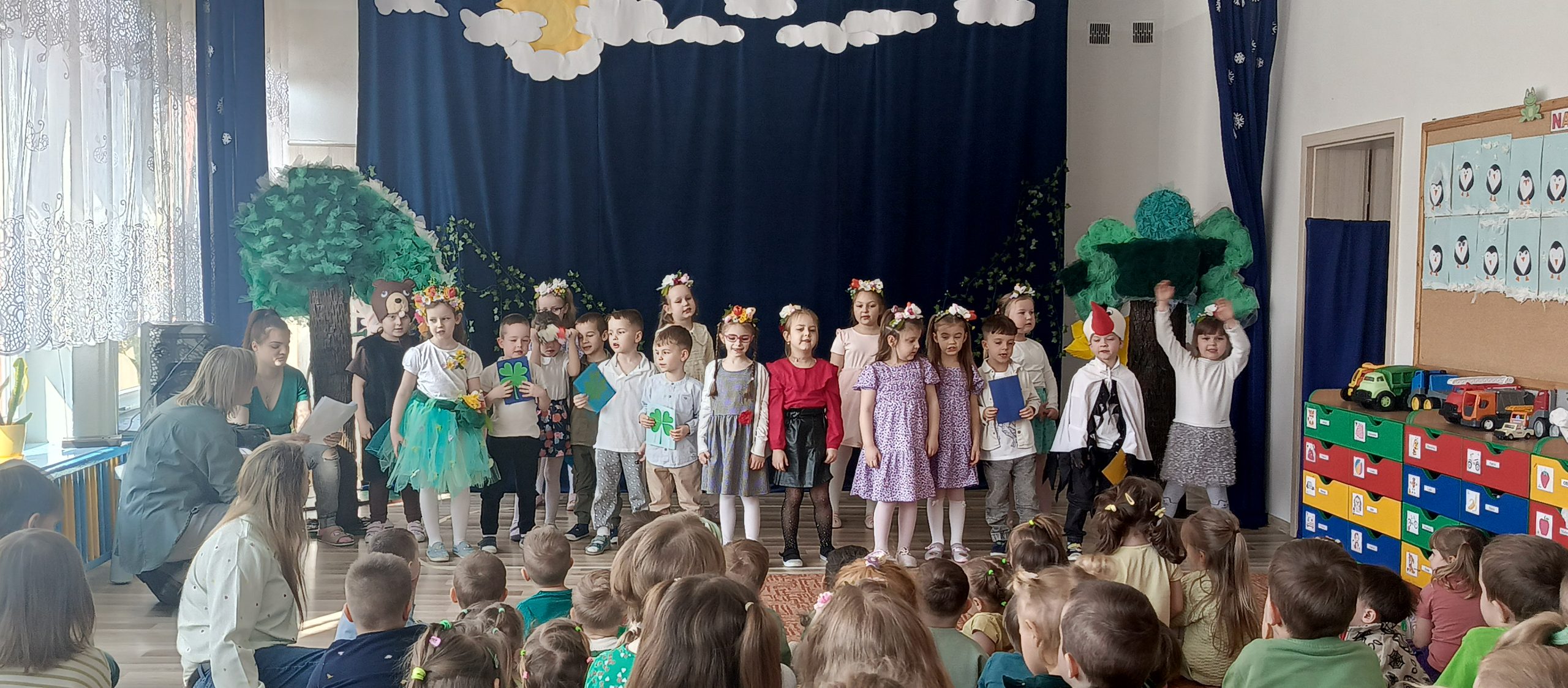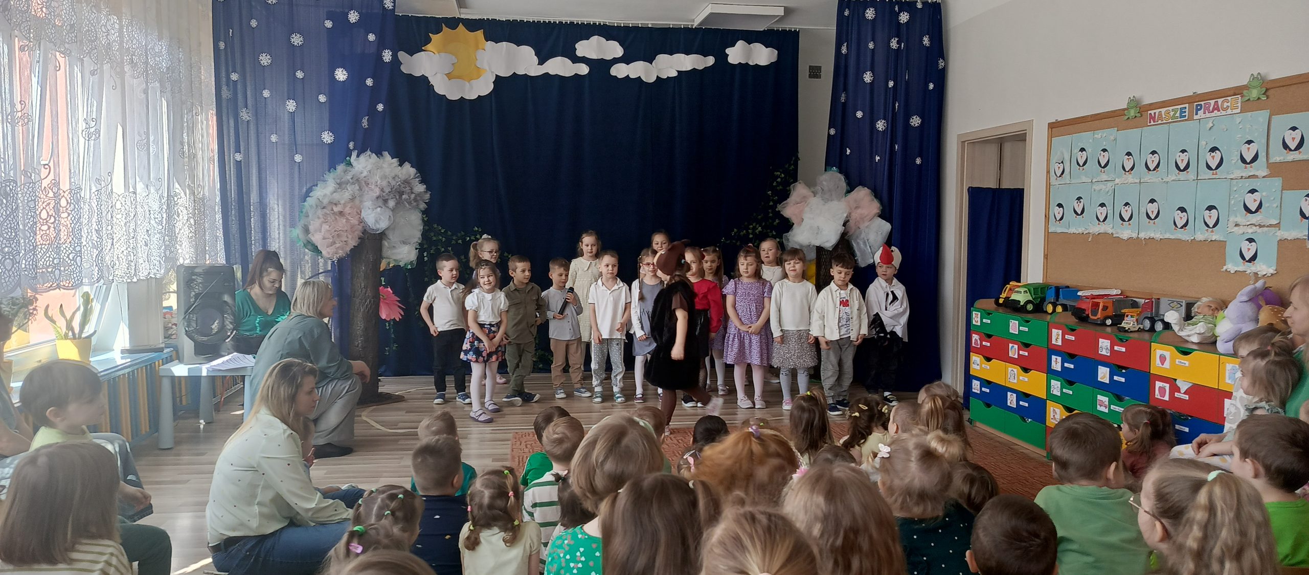 Szczególnym punktem dnia było przedstawienie przygotowane przez grupę „Żabki” pt. „Gdzie jesteś, Wiosno?”. Mali artyści z ogromnym zaangażowaniem wcielili się w swoje role. Dzieci pięknie recytowały wiersze, śpiewały piosenki i tańczyły, wprowadzając widzów w prawdziwie wiosenny nastrój.