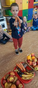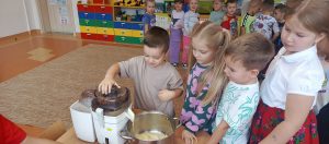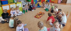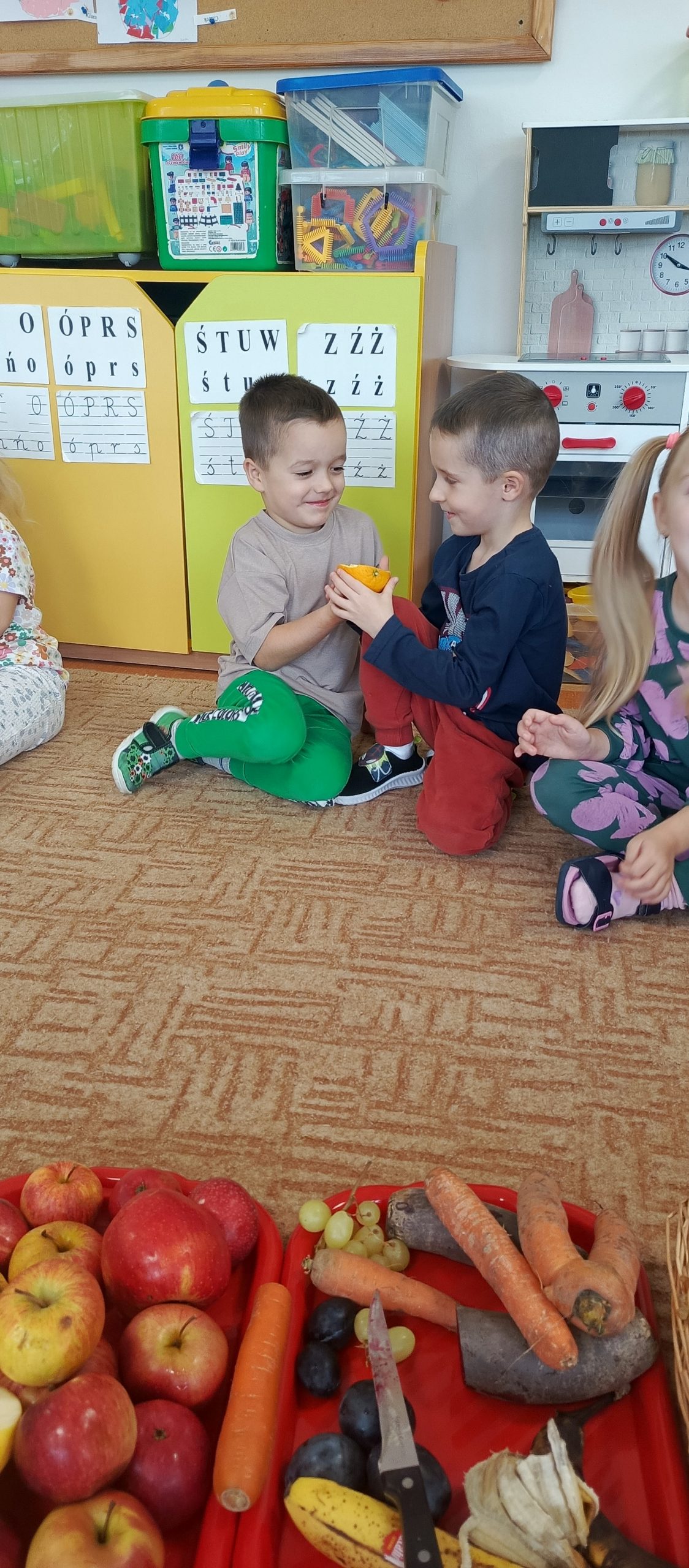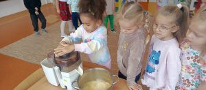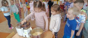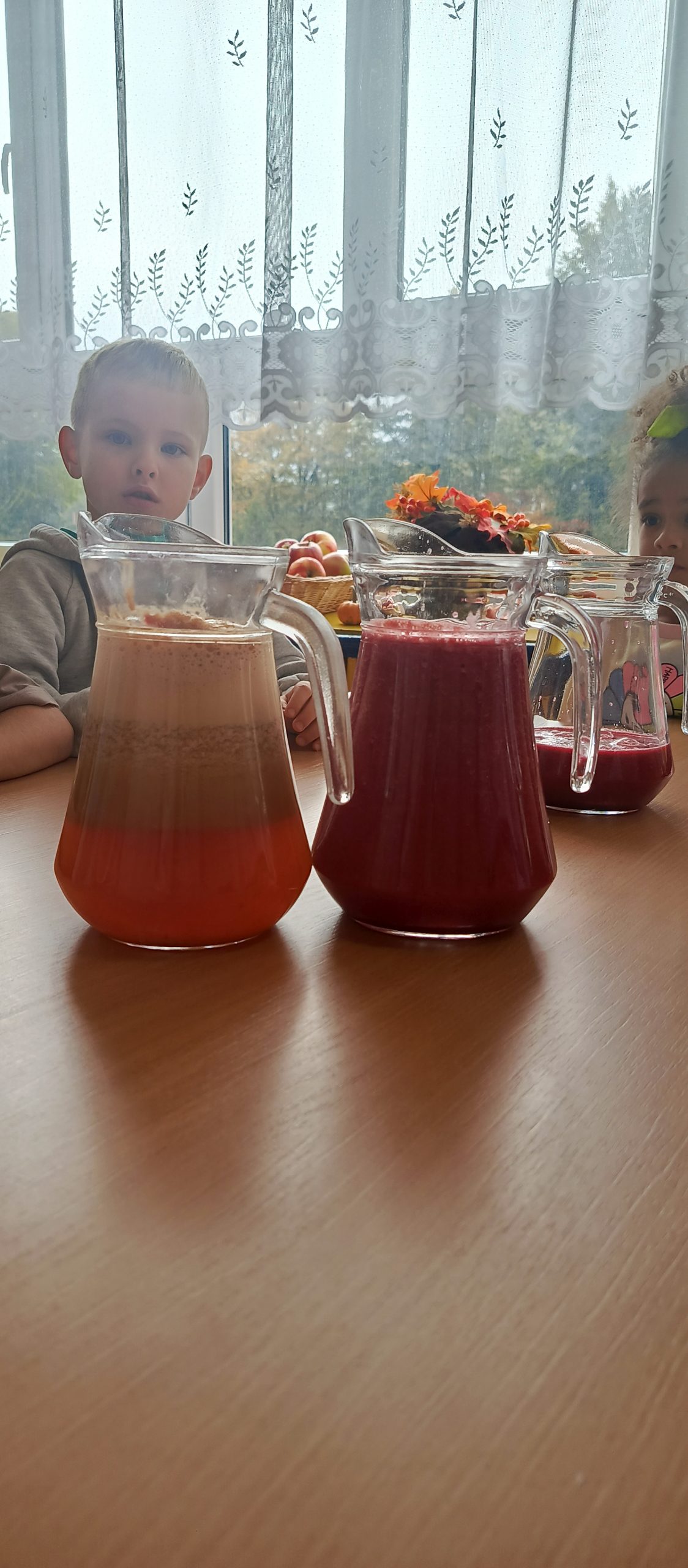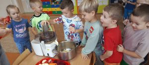 Pszczółki wiedzą, że aby być zdrowym trzeba się dobrze odżywiać, a najwięcej witamin mają owoce i warzywa. Z przyniesionych przez dzieci owoców i warzyw wyczarowaliśmy przepyszne soki – jabłkowy i owocowo – warzywny.  Po zakończonej pracy przystąpiliśmy do degustacji pysznego soczku 🙂