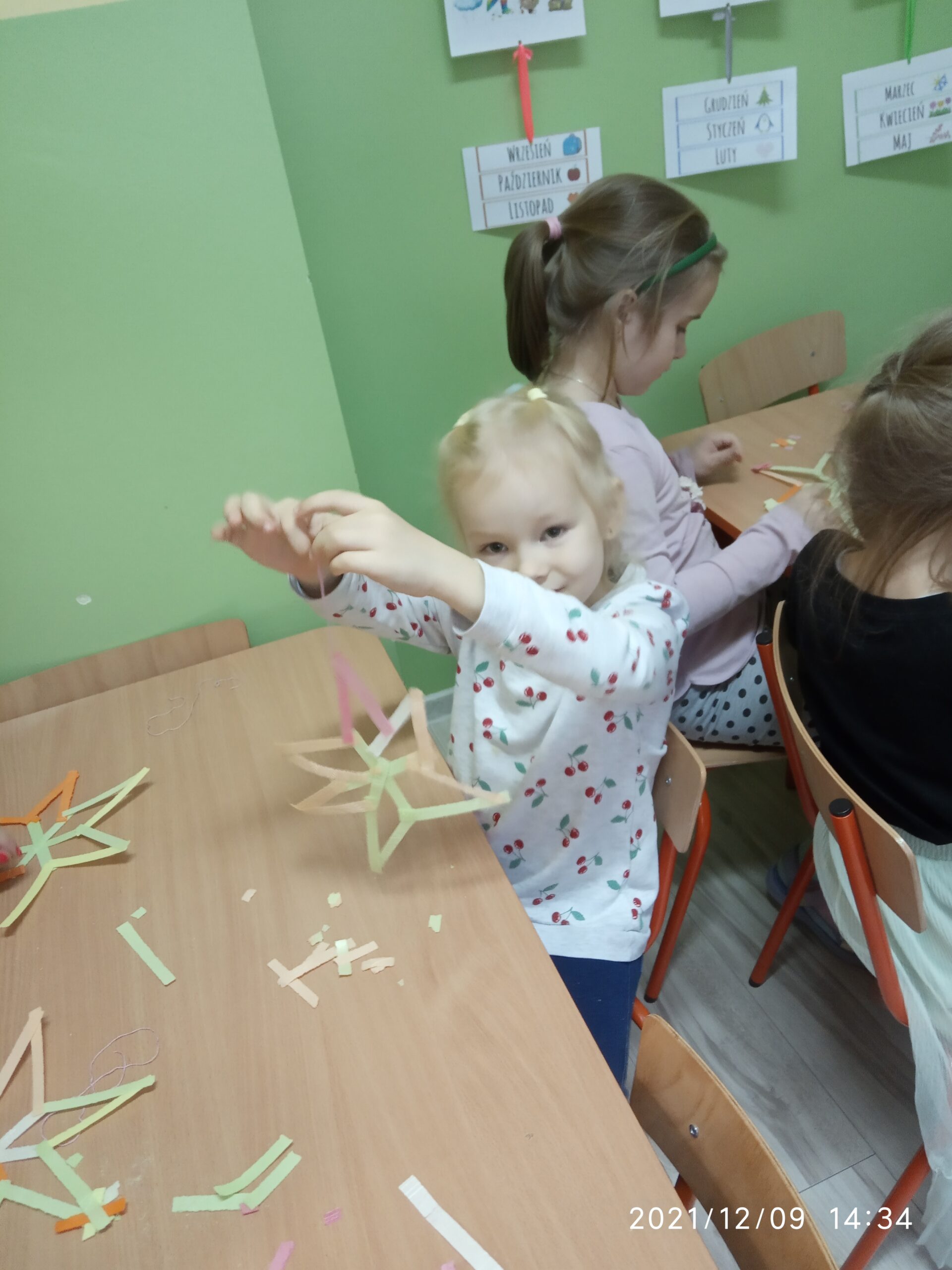 Dnia 09.12.2021r. do przedszkola – przybyła twórczyni ludowa: p. Edyta Sak . Dzieci własnoręcznie wykonywały ozdoby choinkowe z opłatka – symbolu chleba, bez którego nie wyobrażamy sobie Wigilii Bożego Narodzenia. Za sprawą dużej ilości kolorowych opłatków zagościła więc w progach naszego przedszkola świąteczna atmosfera. Przedszkolaki bardzo delikatnie z paseczków opłatka, które sklejały, tworzyły gwiazdę. Największym zaskoczeniem, a zarazem frajdą dla przedszkolaków było łączenie wszystkich elementów, co najciekawsze …. śliną. Dzieci wytrwale tworzyły kolorowe gwiazdy z opłatka i na koniec zajadały niewykorzystane części. Przedszkolaki dowiedziały się od zaproszonych gości, że ozdoby z opłatka są niezwykłym zjawiskiem w polskiej plastyce obrzędowej i tradycyjnym zdobnictwie świątecznym. Są to oryginalne, wyłącznie polskie ozdoby nieznane poza naszym krajem. Dawniej – na początku XX wieku – umieszczano je we wnętrzach mieszkalnych nie tylko dla dekoracji, ale przede wszystkim po to aby opłatek, chleb boży i święty zsyłał na dom pokój i różnorodne dobrodziejstwa. Starano się zatem aby ozdoby te wisiały w izbie jak najdłużej, przynajmniej do Matki Boskiej Gromnicznej. Gwiazdy z opłatka wykonane przez przedszkolaków na warsztatach będą zapewne pięknym podarunkiem dla rodziców i elementem domowej dekoracji świątecznej.