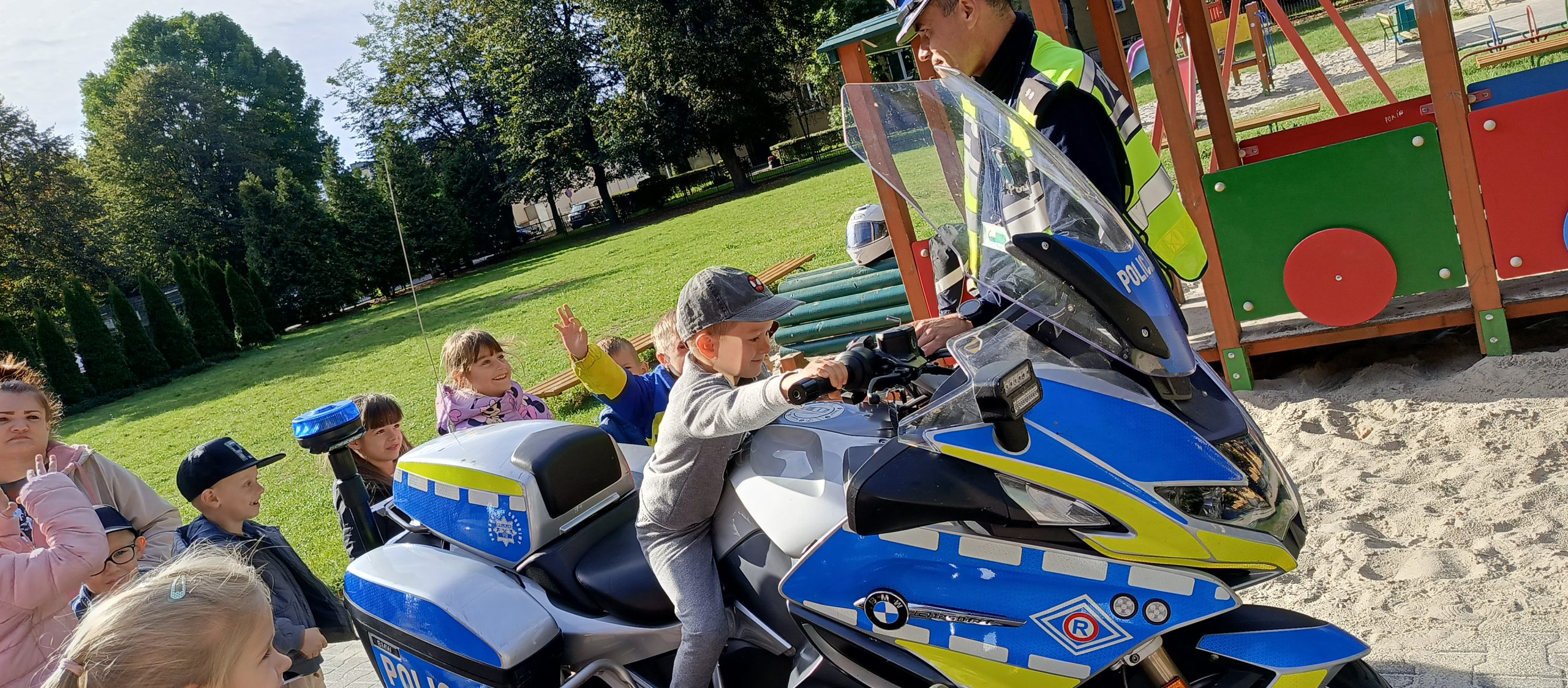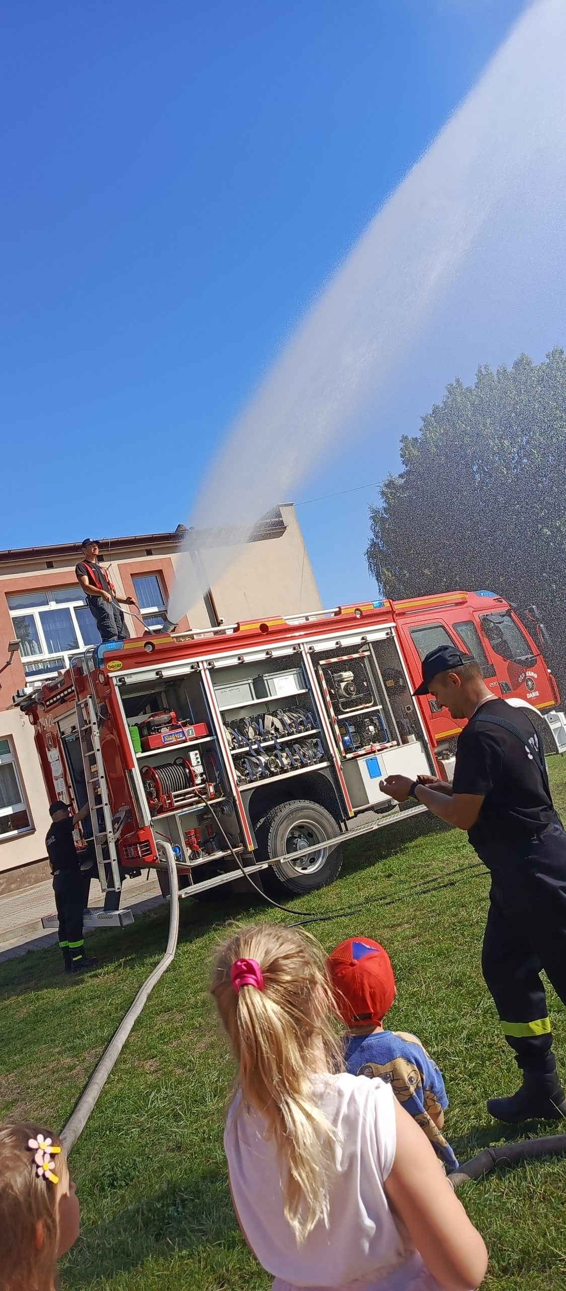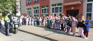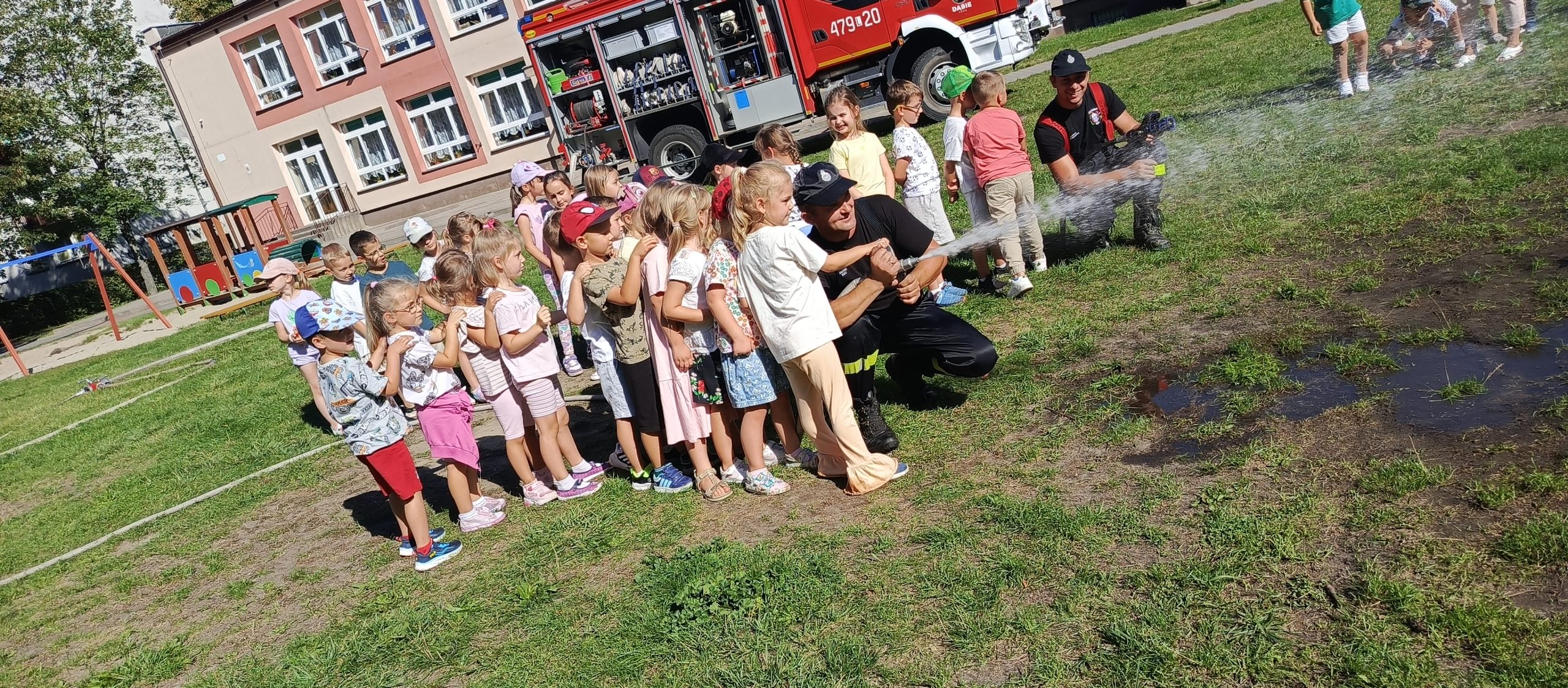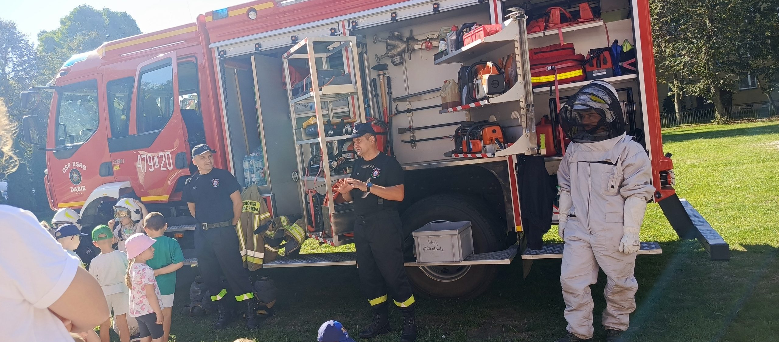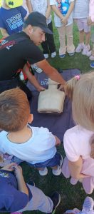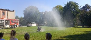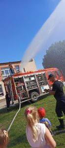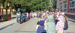 Wrzesień w przedszkolu to miesiąc, w którym poruszane są tematy związane z bezpieczeństwem. Wszystkie dzieci z naszego przedszkola miały możliwość uczestniczenia w spotkaniu ze strażą pożarną – OSP z Dąbia i policją. Podczas wizyty dzieci zapoznały się z zawodem strażaka i policjanta, poznały ciekawostki dotyczące pracy oraz obejrzały akcesoria charakterystyczne dla ich zawodu. Dzięki Ochotniczej Straży Pożarnej z Dąbia mogły zapoznać się udzielaniem pierwszej pomocy, poćwiczyć gaszenie pożaru a także miały okazję obejrzenia z bliska wozu strażackiego oraz zapoznania się z jego wyposażeniem. Były to ważne lekcje bezpieczeństwa, za którą serdecznie dziękujemy.